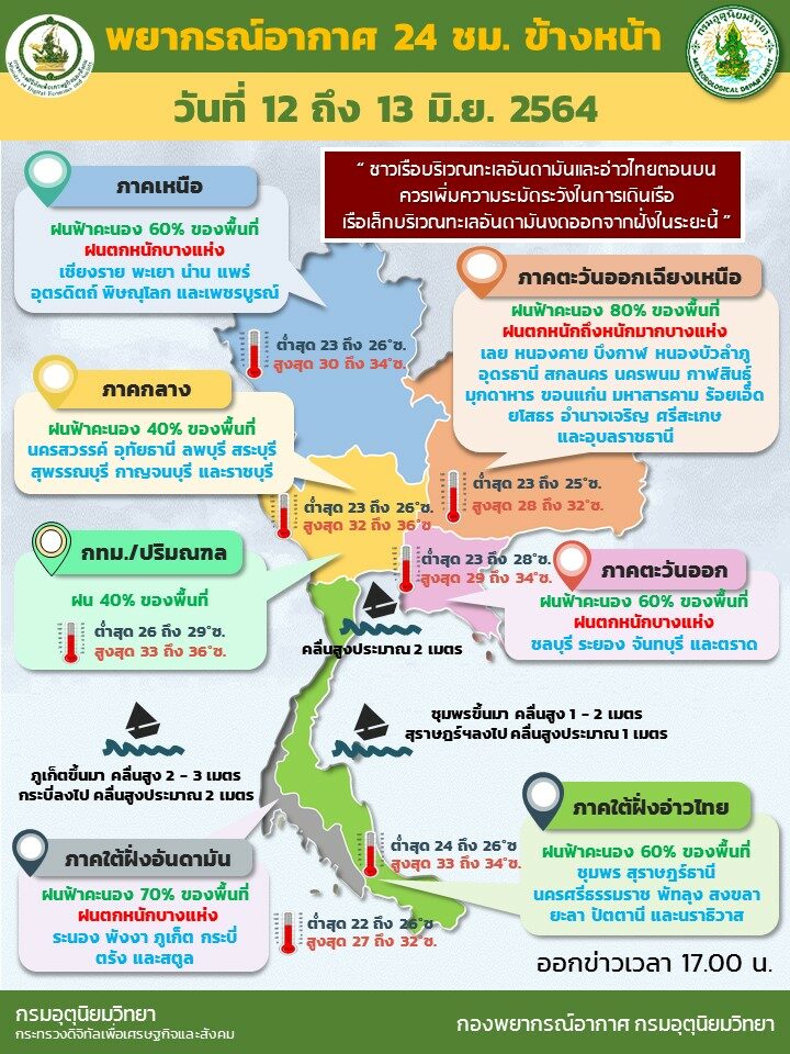 ขณะที่กรมอุตุนิยมวิทยา พยากรณ์อากาศประจำวันที่ 13 มิถุนายน ระบุว่า ลักษณะอากาศทั่วไป พยากรณ์อากาศ 24 ชั่วโมงข้างหน้า ร่องมรสุมพาดผ่านตอนบนของภาคเหนือและประเทศลาวตอนบน เข้าสู่พายุโซนร้อน “โคะงุมะ” บริเวณอ่าวตังเกี๋ย ประเทศเวียดนาม ประกอบกับมรสุมตะวันตกเฉียงใต้กำลังแรงยังคงพัดปกคลุมทะเลอันดามัน ประเทศไทยและอ่าวไทย ลักษณะเช่นนี้ทำให้บริเวณภาคเหนือ ภาคตะวันออกเฉียงเหนือ ภาคตะวันออก และภาคใต้ฝั่งตะวันตก มีฝนตกหนักถึงหนักมากบางแห่ง ขอให้ประชาชนบริเวณดังกล่าวระวังอันตรายจากฝนตกหนักและฝนที่ตกสะสมในระยะนี้ไว้ด้วย สำหรับคลื่นลมบริเวณทะเลอันดามันและอ่าวไทยตอนบนมีกำลังแรง โดยทะเลอันดามันมีคลื่นสูง 2-3 เมตร บริเวณที่มีฝนฟ้าคะนองคลื่นสูงมากกว่า 3 เมตร ส่วนบริเวณอ่าวไทยตอนบนมีคลื่นสูงประมาณ 2 เมตร บริเวณที่มีฝนฟ้าคะนองคลื่นสูงมากกว่า 2 เมตร ขอให้ชาวเรือบริเวณทะเลอันดามันและอ่าวไทยตอนบนควรเพิ่มความระมัดระวังในการเดินเรือ เรือเล็กบริเวณทะเลอันดามันตอนบนควรงดออกจากฝั่งในระยะนี้