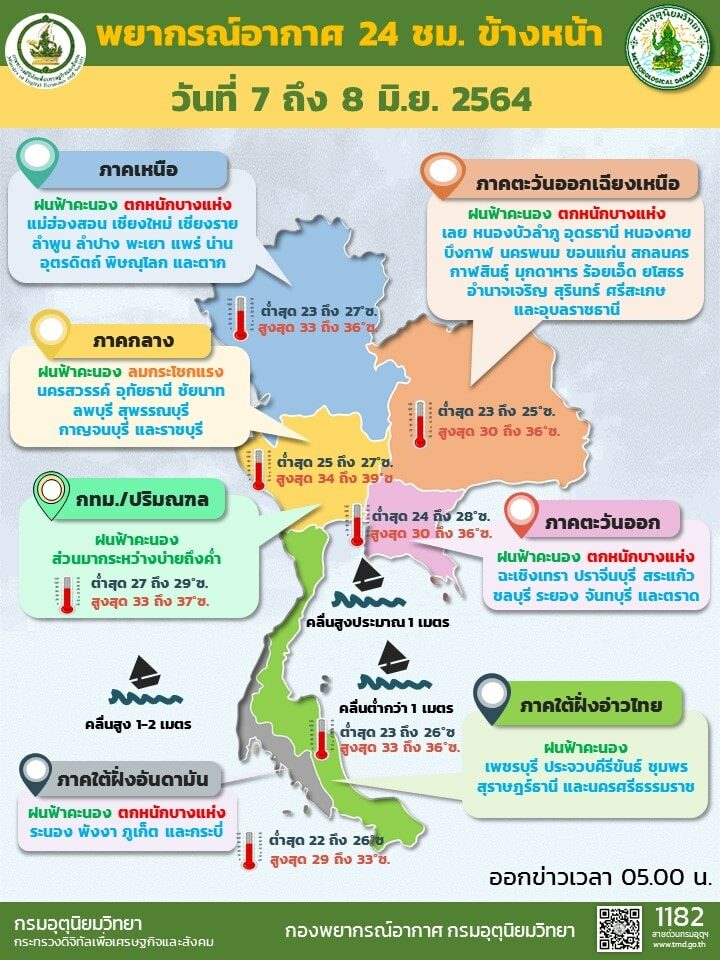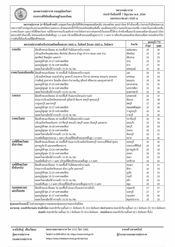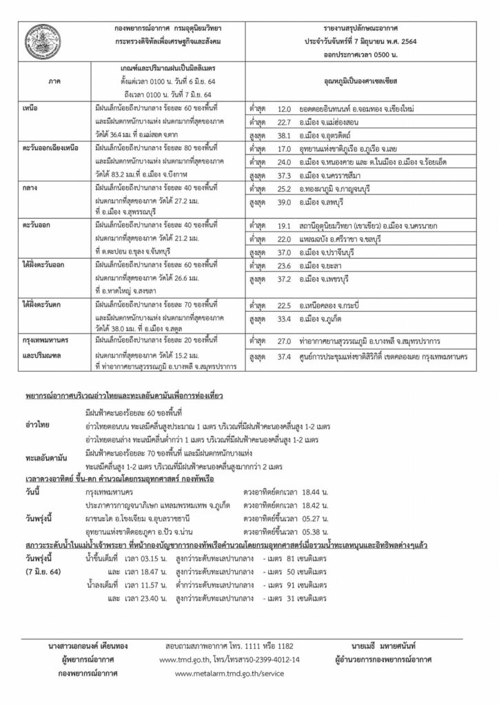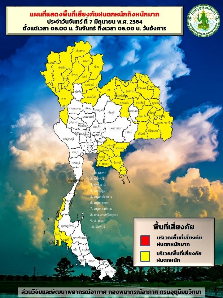 เมื่อวันที่ 7 มิถุนายน กรมอุตุนิยมวิทยา เผยแพร่แผนที่เสี่ยงภัยฝนตกหนัก ถึงหนักมาก ประจำวันจันทร์ที่ 7 มิถุนายน พ.ศ.2564 ตั้งแต่เวลา 06.00 วันจันทร์ ถึงเวลา 06.00 น. วันอังคาร โดยมีพื้นที่เสี่ยงภัยฝนตกหนัก ได้แก่ แม่ฮ่องสอน เชียงใหม่ เชียงราย ลำพูน ลำปาง พะเยา แพร่ น่าน อุตรดิตถ์ พิษณุโลก ตาก เลย หนองบัวลำภู อุดรธานี ขอนแก่น สกลนคร หนองคาย นครพนม กาฬสินธุ์ ร้อยเอ็ด สุรินทร์ ยโสธร มุกดาหาร อำนาจเจริญ อุบลราชธานี ศรีสะเกษ สุรินทร์