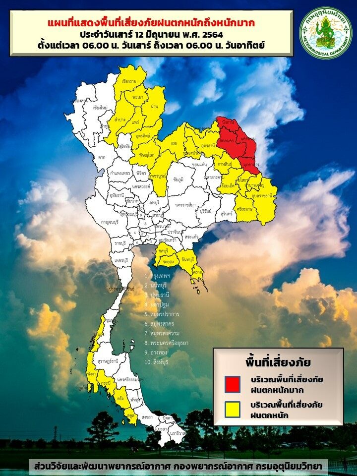 ทั้งนี้ สำหรับพื้นที่เสี่ยงภัยฝนตกหนักถึงหนักมาก ตั้งแต่เวลา 06.00 น.วันเสาร์ ถึง 06.00 น. วันอาทิตย์ นั้น พื้นที่เสียงภัยฝนตกหนักมาก ได้แก่ บึงกาฬ สกลนคร นครพนม มุกดาหาร พื้นที่เสี่ยงภัยฝนตกหนักมาก ได้แก่ เชียงราย ลำปาง พะเยา แพร่ น่าน อุตรดิตถ์ พิษณุโลก เพชรบูรณ์ เลย หนองบัวลำภู อุดรธานี หนองคาย กาฬสินธุ์ ร้อยเอ็ด ยโสธร อำนาจเจริญ อุบลราชธานี ศรีสะเกษ ชลบุรี ระยอง จันทบุรี ตราด ระนอง พังงา กระบี่ ตรัง สตูล