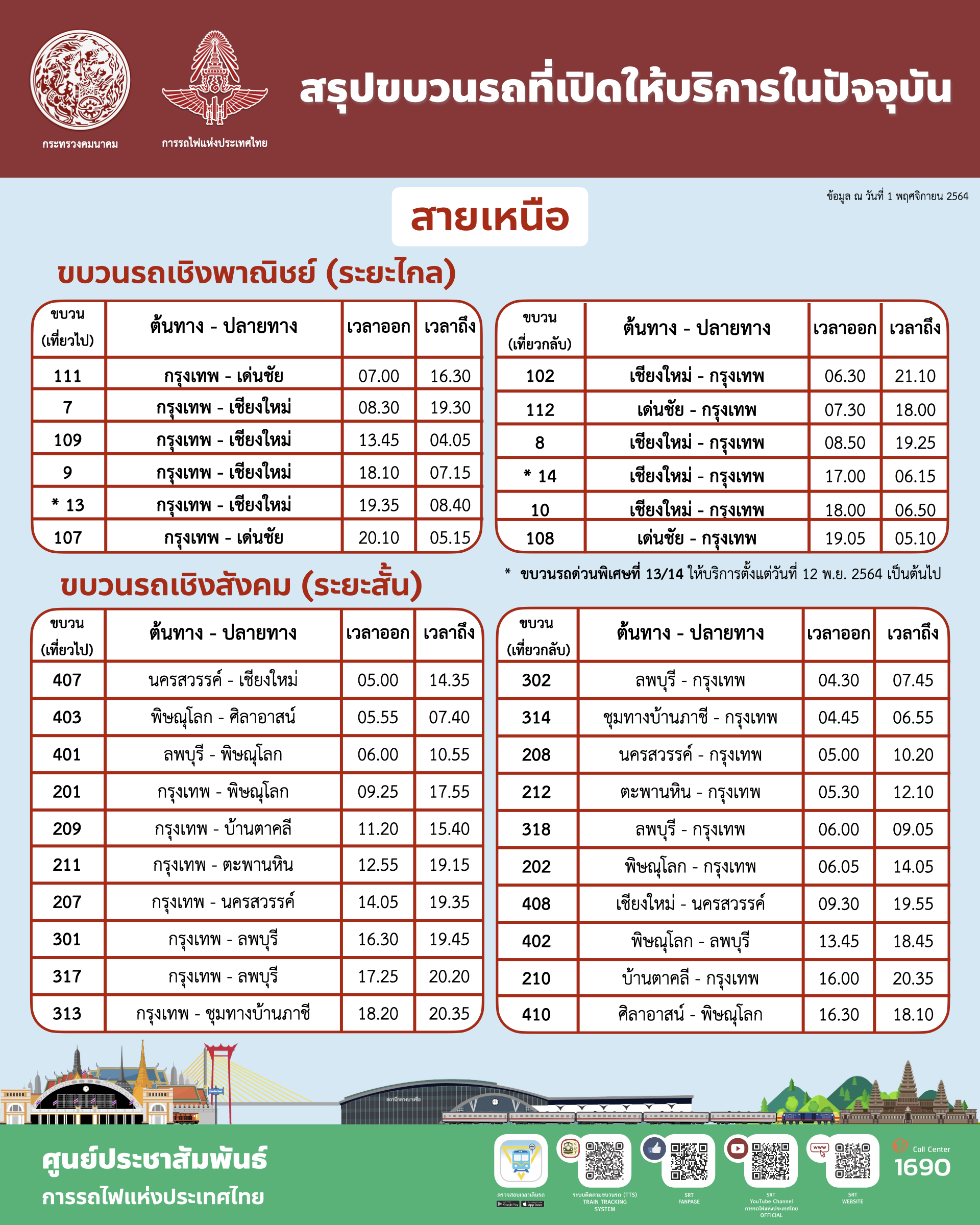 – ขบวนรถด่วนพิเศษที่ 13/14 กรุงเทพ – เชียงใหม่ – กรุงเทพ (เริ่มให้บริการตั้งแต่วันที่ 12 พฤศจิกายน 2564)