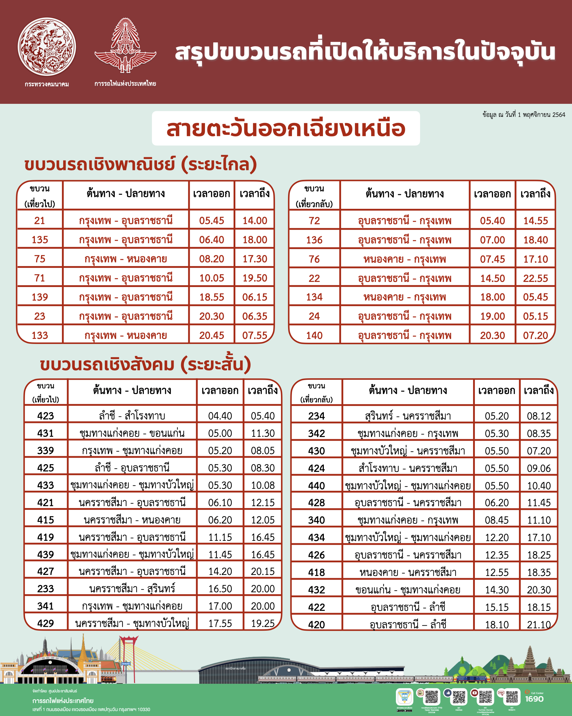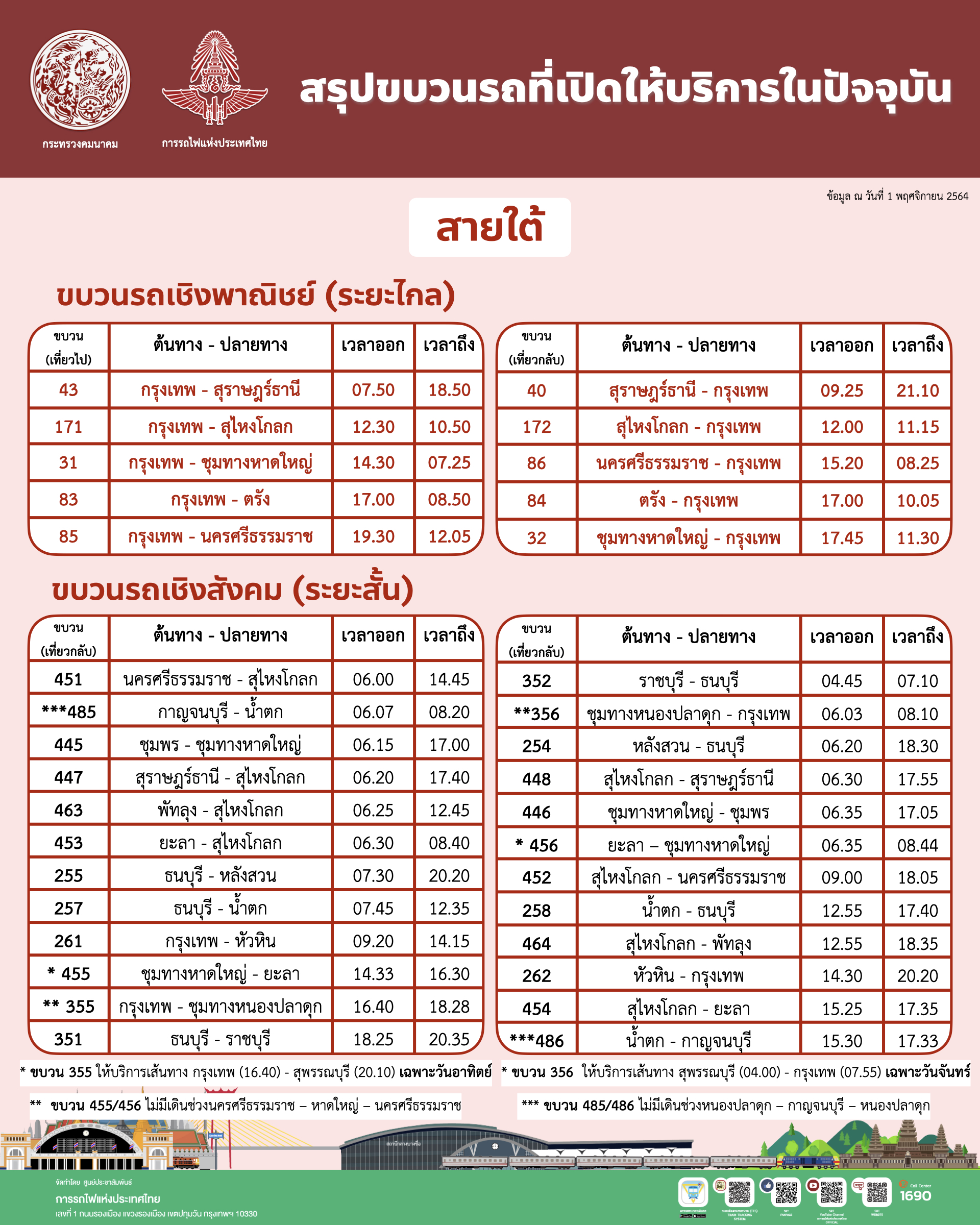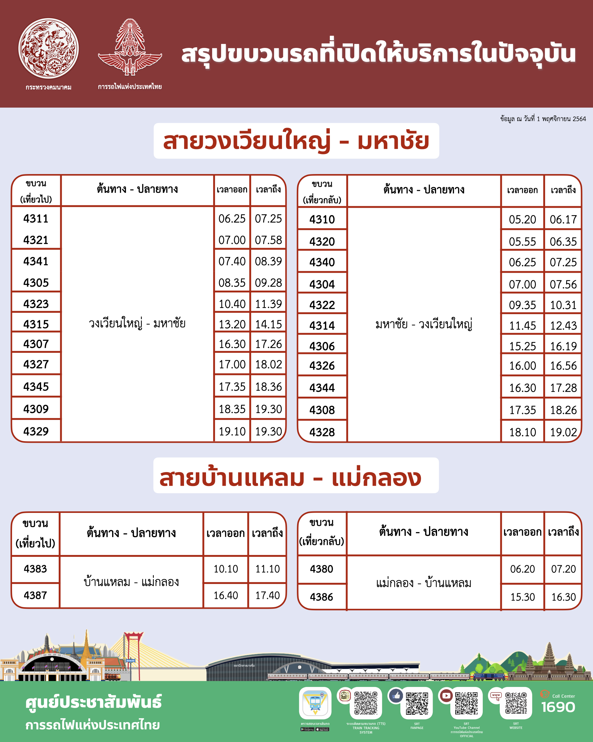 รวมทั้งปรับเปลี่ยนสถานีต้นทางปลายทางในบางขบวนใหม่ เพื่ออำนวยความสะดวกการเดินทางแก่ประชาชน นักเรียน นักศึกษาและนักท่องเที่ยว เริ่มตั้งแต่วันที่ 1 พฤศจิกายน 2564 เป็นต้นไป โดยมีขบวนรถที่ให้บริการในเส้นทางต่าง ๆ ดังนี้
