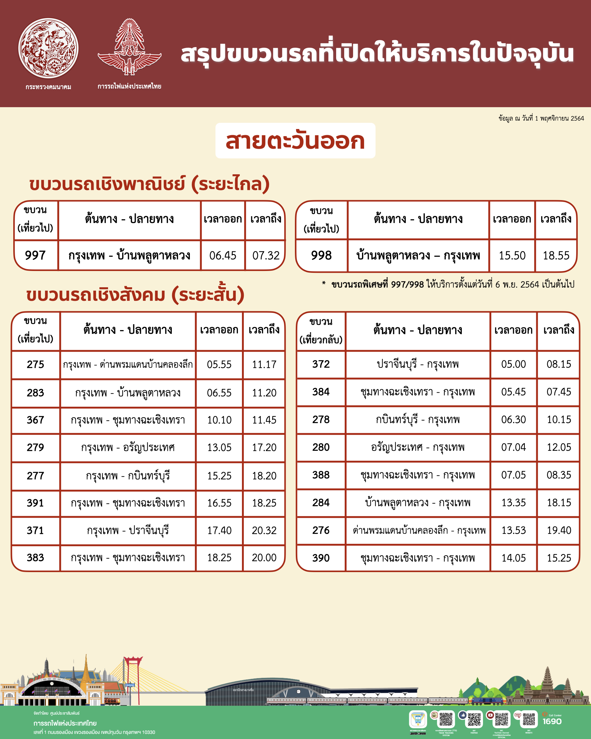 – ขบวนรถพิเศษที่ 997/998 กรุงเทพ – บ้านพลูตาหลวง – กรุงเทพ (ให้บริการตั้งแต่วันที่ 6 พฤศจิกายน 2564)