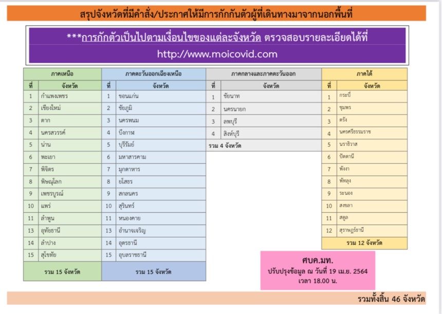 เมื่อวันที่ 19 เม.ย. 64 ผู้สื่อข่าวรายงานว่า กระทรวงมหาดไทย ได้อัพเดตข้อมูล จังหวัดที่มีคำสั่ง/ประกาศให้มีการกักกันตัวผู้ที่เดินทางมาจากนอกพื้นที่ ซึ่งล่าสุดมีการตัดจังหวัดสระบุรีออก และเหลือายชื่ออยู่ 46 จังหวัด ดังนี้