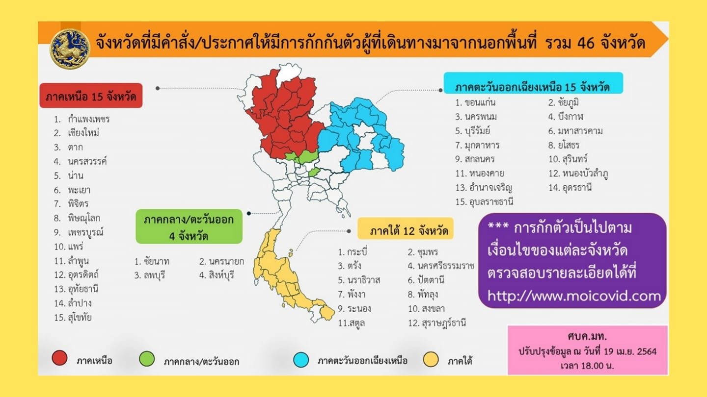 ตัดออกไป 1 อัพเดต 46 จังหวัด ให้กักตัว หากเดินทางมาจากนอกพื้นที่