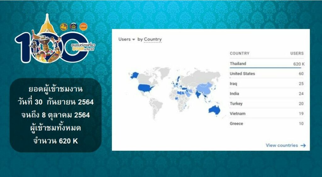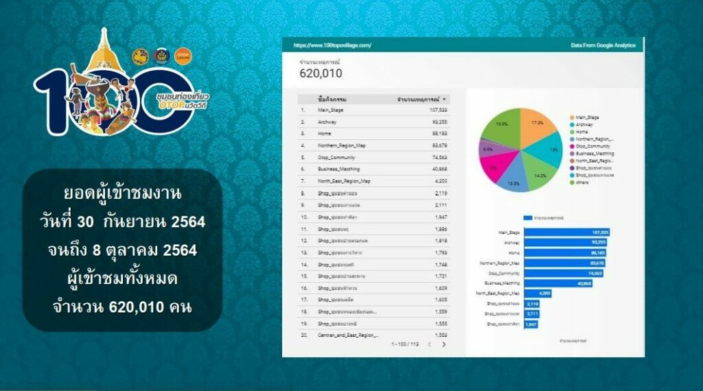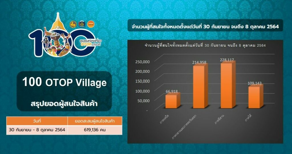 จากการดำเนินงานดังกล่าว ได้ผลตอบรับระดับดีเยี่ยม โดยมีผู้เข้าชมงาน ในรูปแบบเสมือนจริง (Virtual Event) ผ่านเว็ปไซต์ www.100otopvillage.com จำนวน 619,136 คน ภายในงานประกอบด้วย ส่วนข้อมูลชุมชนท่องเที่ยว OTOP นวัตวิถี 4 โซน จำนวน 100 ชุมชน ได้แก่