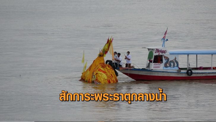 พุทธศาสนิกชนแห่สักการะพระธาตุกลางน้ำ