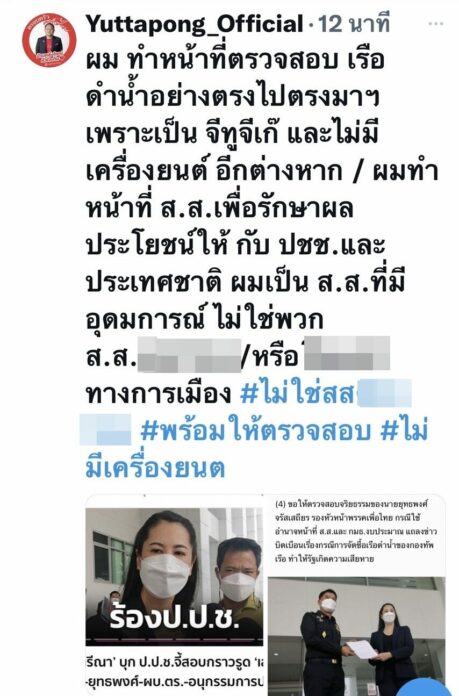 “ผมทำหน้าที่ตรวจสอบเรือดำนํ้าอย่างตรงไปตรงมา เพราะเป็นจีทูจีเก๊ และไม่มีเครื่องยนต์อีกต่างหาก ผมทำหน้าที่ส.ส. เพื่อรักษาผลประโยชน์ให้กับประชาชนและประเทศชาติ ผมเป็นส.ส.ที่มีอุดมการณ์ ไม่ใช่พวกส.ส….หรือ….ทางการเมือง #พร้อมให้ตรวจสอบ #ไม่มีเครื่องยนต์