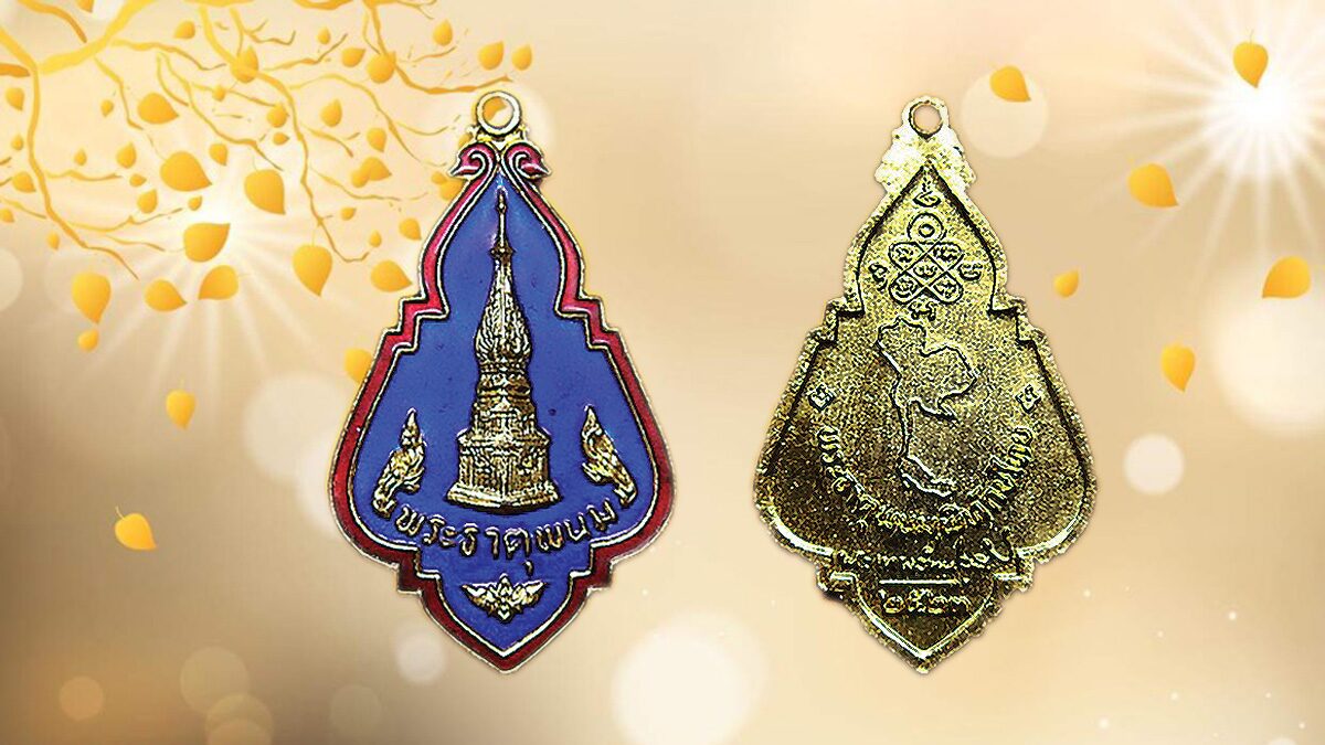 ลักษณะรูปทรงพุ่มข้าวบิณฑ์ มีหูห่วง ด้านหน้าเหรียญ ขอบมีลายเส้นนูนรอบขอบ 2 ชั้น ตามส่วนเว้าโค้ง ตรงกลางเหรียญประดิษฐาน พระธาตุพนมองค์ปัจจุบันลอยนูนเด่น ด้านล่างสลักตัวหนังสือนูนคำว่า “พระธาตุพนม” ซ้ายขวาตัวหนังสือมีพญานาค 2 ตนที่คอยปกปักรักษาพระธาตุพนมชูคอประกบ ด้านล่างสุดสลักลวดลายประกบ