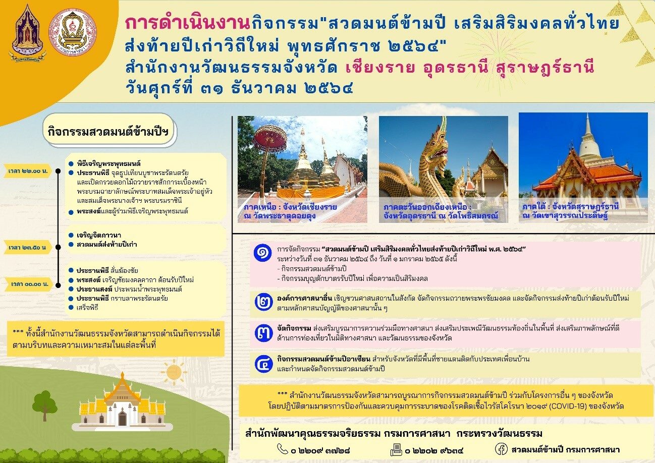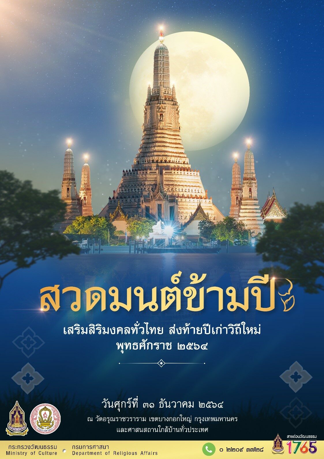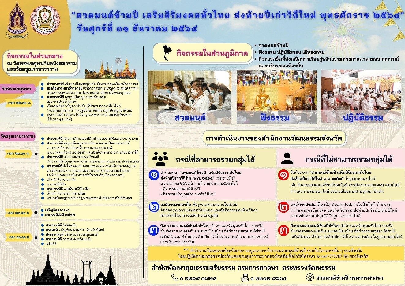 ในคืนวันที่ 31 ธันวาคม 2564 จัดกิจกรรมสวดมนต์ข้ามปี และในช่วงเช้าวันที่ 1 มกราคม 2565 จัดตักบาตรต้อนรับปีใหม่ ณ วัดอรุณราชวราราม เขตบางกอกใหญ่ กรุงเทพมหานคร โดยในคืนวันที่ 31 ธันวาคมนั้นจะได้ร่วมพูดคุยและเยี่ยมชมการจัดงานสวดมนต์ข้ามปีฯ ของจังหวัดที่เป็นตัวแทนภาค ประกอบด้วย ภาคเหนือ (จังหวัดเชียงราย ณ วัดพระธาตุดอยตุง) ภาคตะวันออกเฉียงเหนือ (จังหวัดอุดรธานี ณ วัดโพธิสมภรณ์) และภาคใต้ (จังหวัดสุราษฎร์ธานี ณ วัดเขาสุวรรณประดิษฐ์) ผ่านระบบอิเล็กทรอนิกส์ (Zoom) นอกจากนั้นยังได้ขอให้องค์การศาสนาพุทธ ศาสนาคริสต์ ศาสนาพราหมณ์-ฮินดู และศาสนาซิกข์ เชิญชวนศาสนสถานในสังกัด จัดกิจกรรมส่งท้ายปีเก่าต้อนรับปีใหม่และถวายพระพรชัยมงคลแด่พระบาทสมเด็จพระเจ้าอยู่หัว สมเด็จพระนางเจ้าฯ พระบรมราชินี และพระบรมวงศานุวงศ์ ตามหลักศาสนบัญญัติของศาสนานั้นๆ รวมไปถึงกรมการศาสนายังได้ขอความร่วมมือจังหวัดที่มีชายแดนติดกับประเทศเพื่อนบ้าน 15 จังหวัด ได้แก่ จังหวัดระนอง หนองคาย สุรินทร์ อุบลราชธานีมุกดาหาร บึงกาฬ เลย นครพนม สงขลา แม่ฮ่องสอน ตราด ศรีสะเกษ เชียงราย สระแก้ว และตาก จัดกิจกรรมสวดมนต์ข้ามปีอาเซียนอีกด้วย