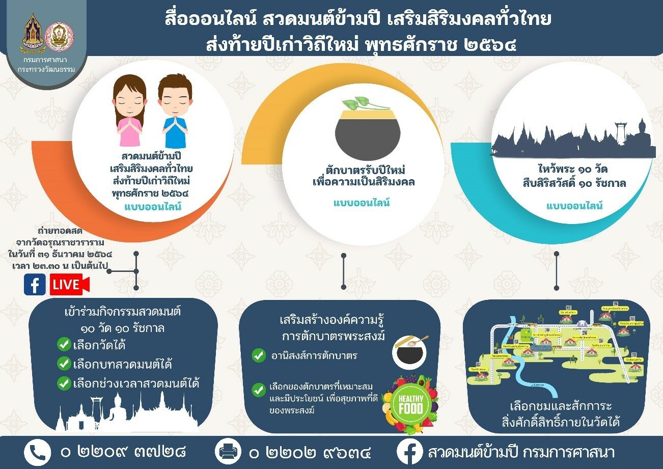 นอกจากนี้ กรมการศาสนา ยังได้จัดทำ Web Application สวดมนต์ข้ามปี เสริมสิริมงคลทั่วไทย ส่งท้ายปีเก่าวิถีใหม่ เพื่อให้ประชาชนทุกกลุ่มวัยสามารถเข้าร่วมกิจกรรมต่างๆ คือ กิจกรรมสวดมนต์ 10 วัด 10 รัชกาล โดยสามารถเลือกวัด เลือกบทสวดมนต์ และช่วงเวลาในการสวดมนต์ได้, กิจกรรมไหว้พระ 10 วัด 10 รัชกาล เรียนรู้เกี่ยวกับประวัติความเป็นมาและสถานที่สำคัญของวัดที่เกี่ยวเนื่องกับพระบรมราชจักรีวงศ์ทั้ง 10 รัชกาล และความรู้เรื่องทานบารมี ซึ่งเป็นคติความเชื่อของคนไทยในเรื่องการทำบุญตักบาตรรับปีใหม่