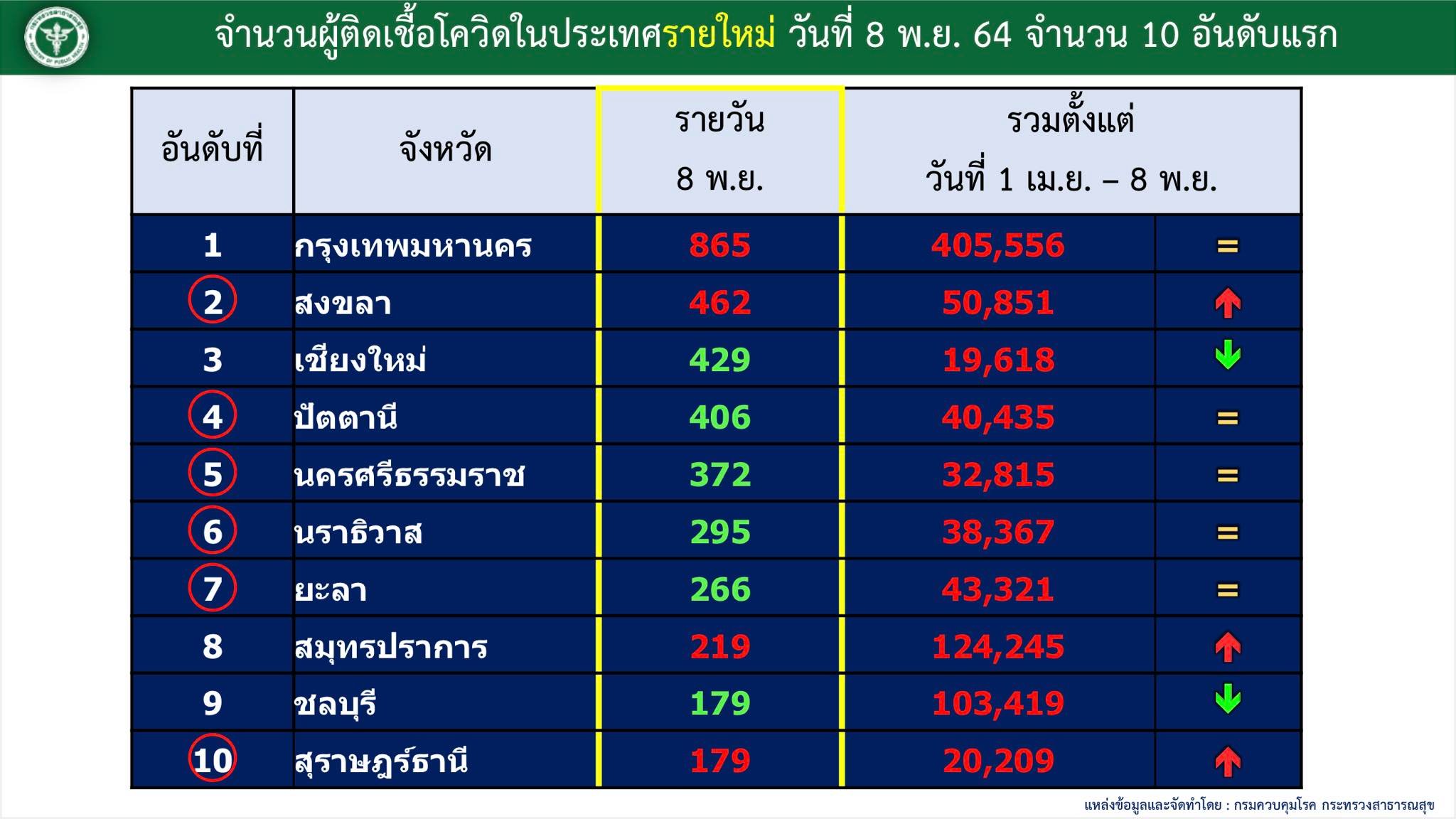 สำหรับ 10 จังหวัดที่ติดเชื้อรายใหม่สูงสุดวันนี้ อันดับ 1 ยังเป็น กรุงเทพมหานคร จำนวน 865 ราย รองลงมาเป็นสงขลา 462 ราย เชียงใหม่ 429 ราย ปัตตานี 406 ราย นครศรีธรรมราช 372 ราย นราธิวาส 295 ราย ยะลา 266 ราย สมุทรปราการ 219 ราย ชลบุรี 179 ราย และสุราษฎร์ธานี 179 ราย
