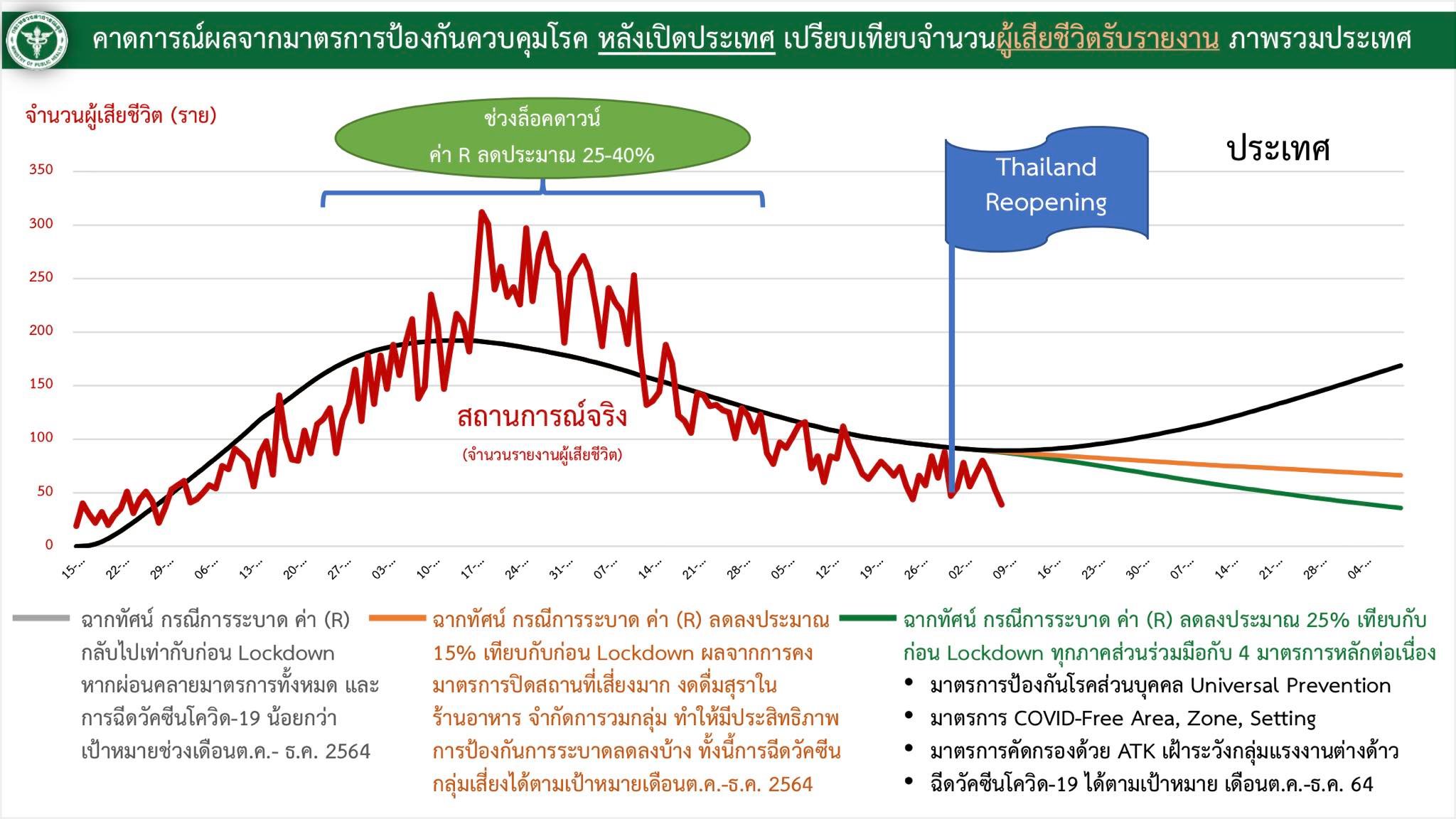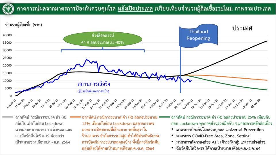 “ขณะที่ภาพของปัจจุบัน แม้ว่าจะมีการเปิดประเทศแล้ว จะเห็นว่าเรายังประคับประคองอยู่ภายในเส้นสีเขียว ซี่งเราอยากให้เห็นทิศทางอย่างนี้ต่อไป แต่ฉากทัศน์ที่แสดงให้เห็นเป็นกราฟเส้นสีดำพุ่งสูงขึ้นลอยฟ้าคือกรณีที่เราสบายอกสบายใจมากจนเกินไป มีการย่อหย่อนมาตรการ ร้านอาหารเปิด ไม่ค่อยระมัดระวัง หรือโรงเรียนเปิด สถานประกอบการเปิด อาจมีการหละหลวมและทำให้ผู้ติดเชื้อขยับขึ้นมาเป็นระดับหลายหมื่นเหมือนที่เคยเป็นมาก่อน”