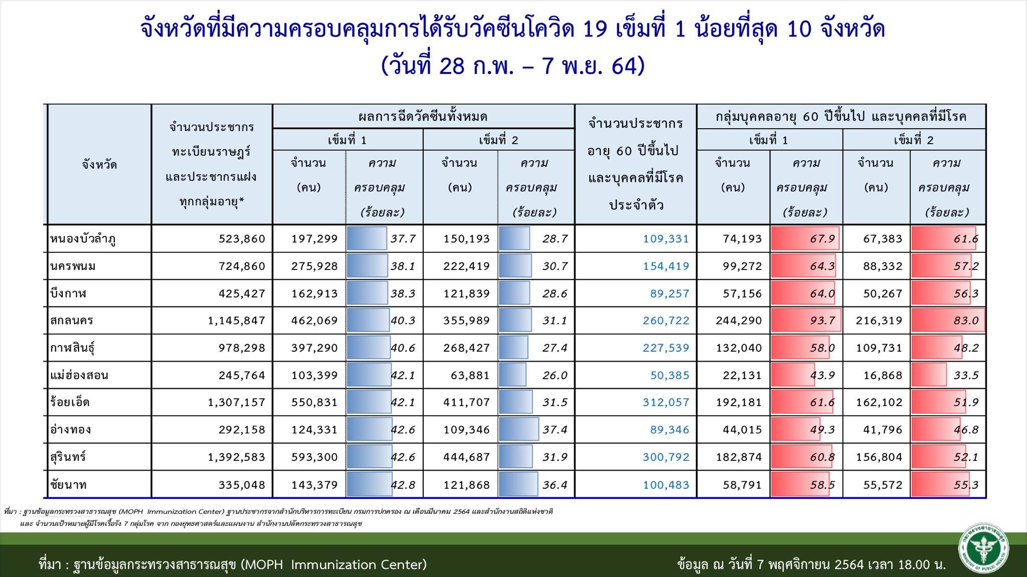 ส่วนจังหวัดที่อัตราการฉีดวัคซีนได้น้อย คือ หนองบัวลำภู วัคซีนเข็ม 1 ครอบคลุม 37.7% นครพนม 38.1% แม่ฮ่องสอน 42.1% สกลนคร 40.3% ในกลุ่มจังหวัดเหล่านี้ แม้เข็มหนึ่งค่อนข้างน้อย แต่จะเห็นได้ชัดว่ามีการเทไปให้กลุ่มผู้สูงอายุและผู้มีโรคประจำตัว อย่าง หนองบัวลำภู ผู้สูงอายุฉีดไปแล้ว 67.% นครพนม 64.3% สกลนคร 93.7%
