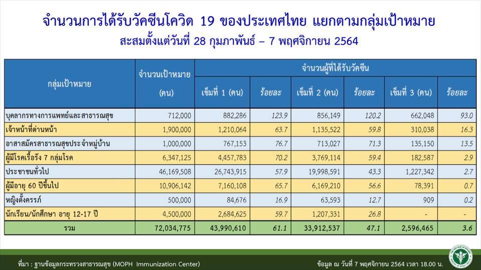 โดยบุคลากรทางการแพทย์หรือด่านหน้ารับวัคซีนเข็มที่ 3 ไปแล้ว 90% กลุ่ม 7 โรคเรื้อรัง 7 กลุ่มโรค ได้รับวัคซีนเข็มแรกไปแล้ว 70.2% เข็มสอง 59.4% กลุ่มผู้สูงอายุ 60 ปี เข็มหนึ่งอยู่ 65.7% เป็นทิศทางตามแผนที่ครอบคลุมวัคซีนและกลุ่มเสี่ยงหลักคือกลุ่มผู้สูงอายุและผู้มีโรคประจำตัว