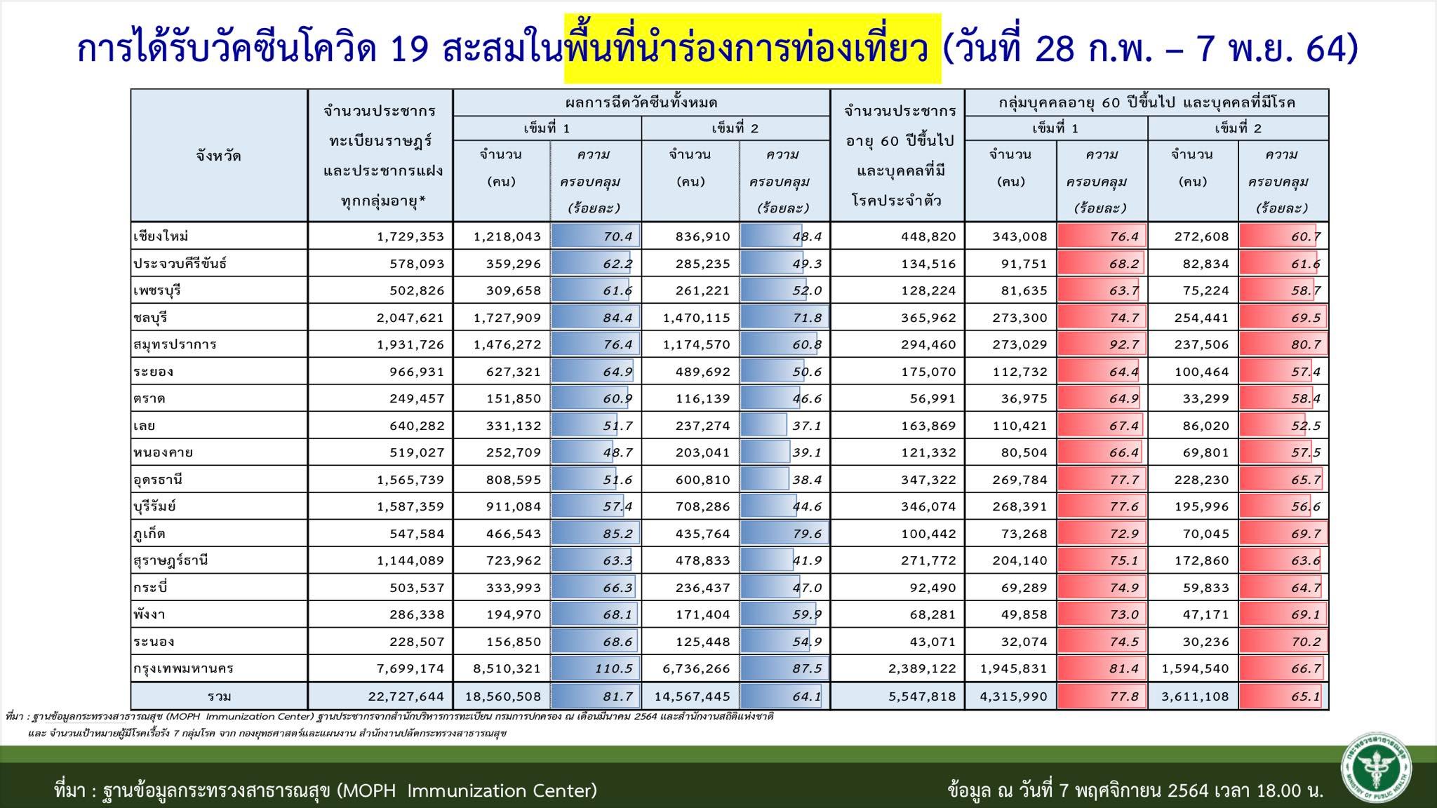 ส่วนอีก 2 จังหวัดที่เพิ่งจะถึง 50% คือ อุดรธานี 51.6% กลุ่มสูงอายุ 77.7% และเลย 51.7% ครอบคลุมกลุ่มผู้สูงอายุ 67.4% ขอให้พื้นที่นำร่องท่องเที่ยวที่เกินเป้าหมายไปแล้วยังคงต้องเร่งระดมฉีดต่อไป เพราะตัวเลขครอบคลุมสูงทำให้ประชาชนในพื้นที่มีความปลอดภัยมากขึ้น