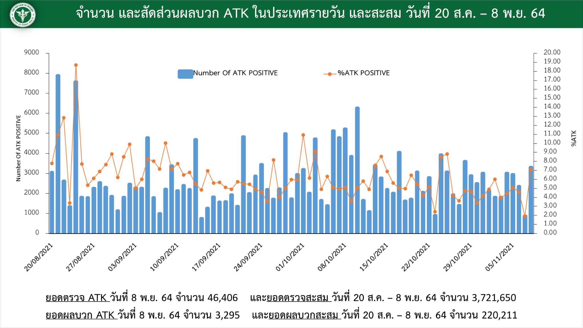 เช่นเดียวกับผลตรวจ ATK วันนี้ก็ยังเป็นไปในทิศทางเดียวกัน และต่ำกว่า 10% โดยยอดตรวจ ATK วันที่ 8 พ.ย. 64 มีจำนวน 46,406 ราย ยอดตรวจสะสมวันที่ 20 ส.ค.-8 พ.ย. 64 มีจำนวน 3,721,650 ราย และยอดผลบวก ATK วันที่ 8 พ.ย. 64 มีจำนวน 3,295 ราย และยอดผลบวกสะสมวันที่ 20 ส.ค.-8 พ.ย. 64 มีจำนวน 220,211 ราย