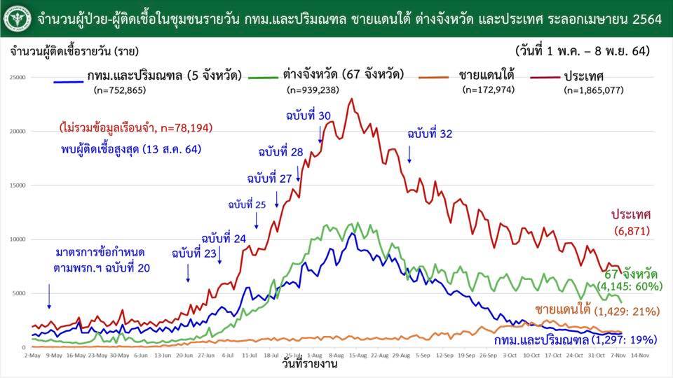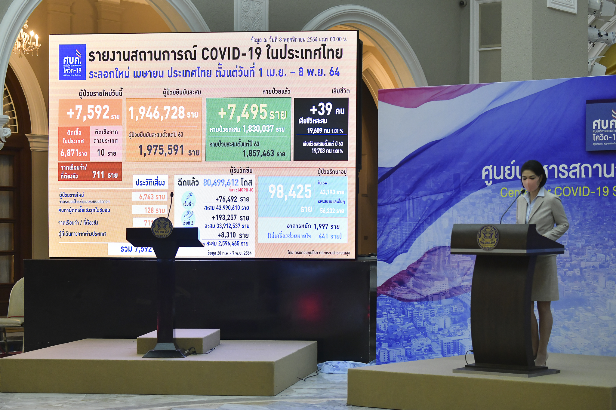 วันที่ 8 พฤศจิกายน 2564 แพทย์หญิงอภิสมัย ศรีรังสรรค์ ผู้ช่วยโฆษกศูนย์บริหารสถานการณ์โควิด-19 (ศบค.) แถลงสถานการณ์ประจำวันว่า ข้อมูลตั้งแต่วันที่ 1 เมษายน 2564 พบผู้ป่วยรายใหม่ 7,592 ราย หายป่วยแล้ว 1,830,037 ราย ผู้ป่วยยืนยันสะสม 1,946,728 ราย เสียชีวิตสะสม 19,609 ราย