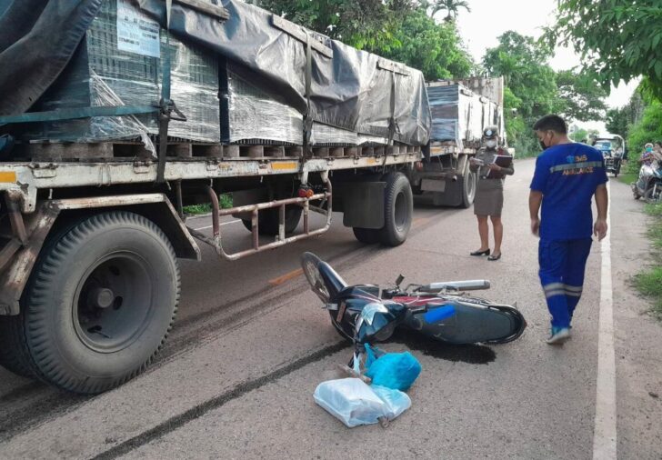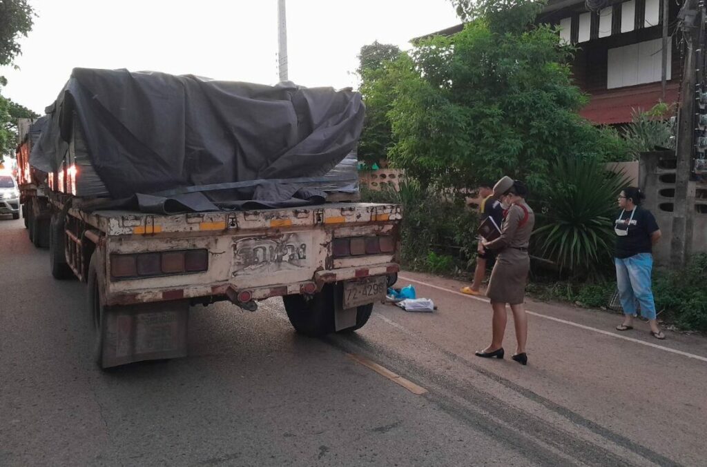 ที่เกิดเหตุพบรถจักรยานยนต์ยี่ห้อฮอนด้า รุ่นเวฟ 110 สีดำ-แดง หมายเลขทะเบียน คงง 665 อุดรธานี ล้มคว่ำอยู่ท้ายรถพ่วง 18 ล้อ ยี่ห้อ ฮีโน่ สีขาว ทะเบียนหัวลาก 72-4296 กรุงเทพมหานคร ลูกพ่วง 72-4299 กรุงเทพมหานคร สภาพรถจักรยานยนต์พังยับเยิน ใกล้กันพบร่างนางพร สัตบุตร อายุ 57 ปี ต.เมืองหมี อ.เมือง จ.หนองคาย อาชีพคนงานก่อสร้าง นอนเสียชีวิตอยู่กลางถนน สภาพกะโหลกศีรษะแตกเลือดไหลนองเต็มพื้น โดยมีนายสัญธยา บัวเงิน อายุ 48 ปี เป็นคนขับรถพ่วง 18 ล้อ ยืนรอให้การกับเจ้าหน้าที่ตำรวจอยู่ในที่เกิดเหตุ