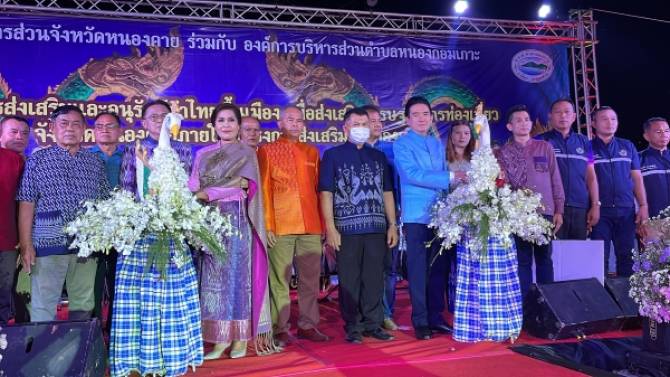 เมื่อเวลา 19.00 น.วันที่ 7 พ.ย.65 ที่สวนสาธารณะหนองกอมเกาะ ต.หนองกอมเกาะ อ.เมือง จ.หนองคาย นายยุทธนา ศรีตะบุตร นายกอบจ.หนองคาย เป็นประธานเปิดงานส่งเสริมและอนุรักษ์ผ้าไทยพื้นเมืองเพื่อส่งเสริมเศรษฐกิจการท่องเที่ยวจังหวัดหนองคาย โดยมีนางสุภา นันทะมีชัย นายก อบต.หนองกอมเกาะ กล่าวรายงานถึงวัตถุประสงค์