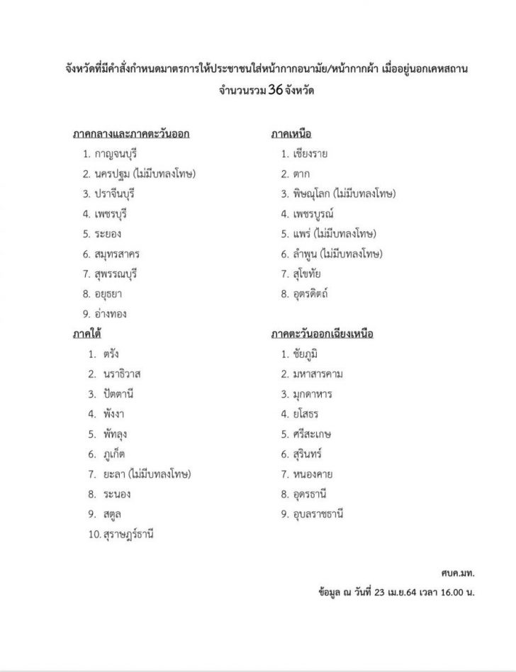 วันที่ 23 เมษายน 64 ผู้สื่อข่าวรายงาน ศูนย์บริหารสถานการณ์โรคโควิด-19 กระทรวงมหาดไทย (ศบค.มท.) ได้ประกาศรายชื่อจังหวัดที่มีคำสั่งกำหนดมาตรการให้ประชาชนใส่หน้ากากอนามัย/หน้ากากผ้า เมื่ออยู่นอกเคหสถาน หากฝ่าฝืนจะต้องโทษปรับเป็นเงินจำนวน 20,000 บาท