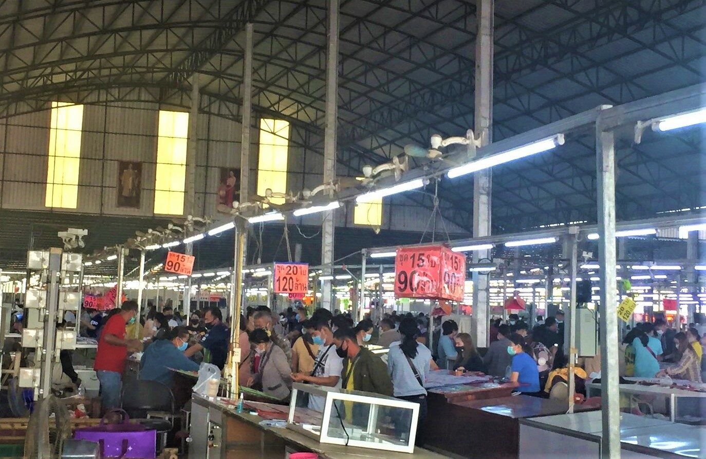 เมื่อวันที่ 21 พฤศจิกายน 64 ผู้สื่อข่าวรายงานว่า ที่ตลาดขายส่งลอตเตอรี่ อ.วังสะพุง จ.เลย ซึ่งเป็นตลาดการซื้อขายลอตเตอรี่ที่ใหญ่สุดในภาคอีสาน บรรยากาศยังคงคึกคักมีผู้ค้าสลากฯทั้งรายย่อยและรายใหญ่ เดินทางมาซื้อขายกันเป็นจำนวนมาก รถยนต์จอดเรียงรายหนาแน่นริมถนนมลิวรรณ รวมทั้งมีมาตรการการเข้าออก ป้องกันโควิด-19 อย่างเคร่งครัด