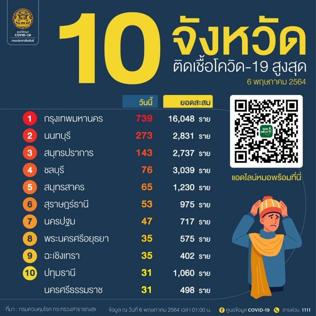 ศบค. ยังได้เปิดเผย จำนวนผู้ติดเชื้อสูงสุด 10 จังหวัด โดยกรุงเทพมหานครยังคงมีผู้ติดเชื้อสูงสุด 739 คน ตามมาด้วยนนทบุรี 273 คน และสมุทรปราการ 143 คน ขณะที่จังหวัดชลบุรี สมุทรสาคร สุราษฎร์ธานี นครปฐม พระนครศรีอยุธยา ฉะเชิงเทรา ปทุมธานี และนครศรีธรรมชาติ ติดในอันดับผู้ติดเชื้อสูงสุด 11 จังหวัด