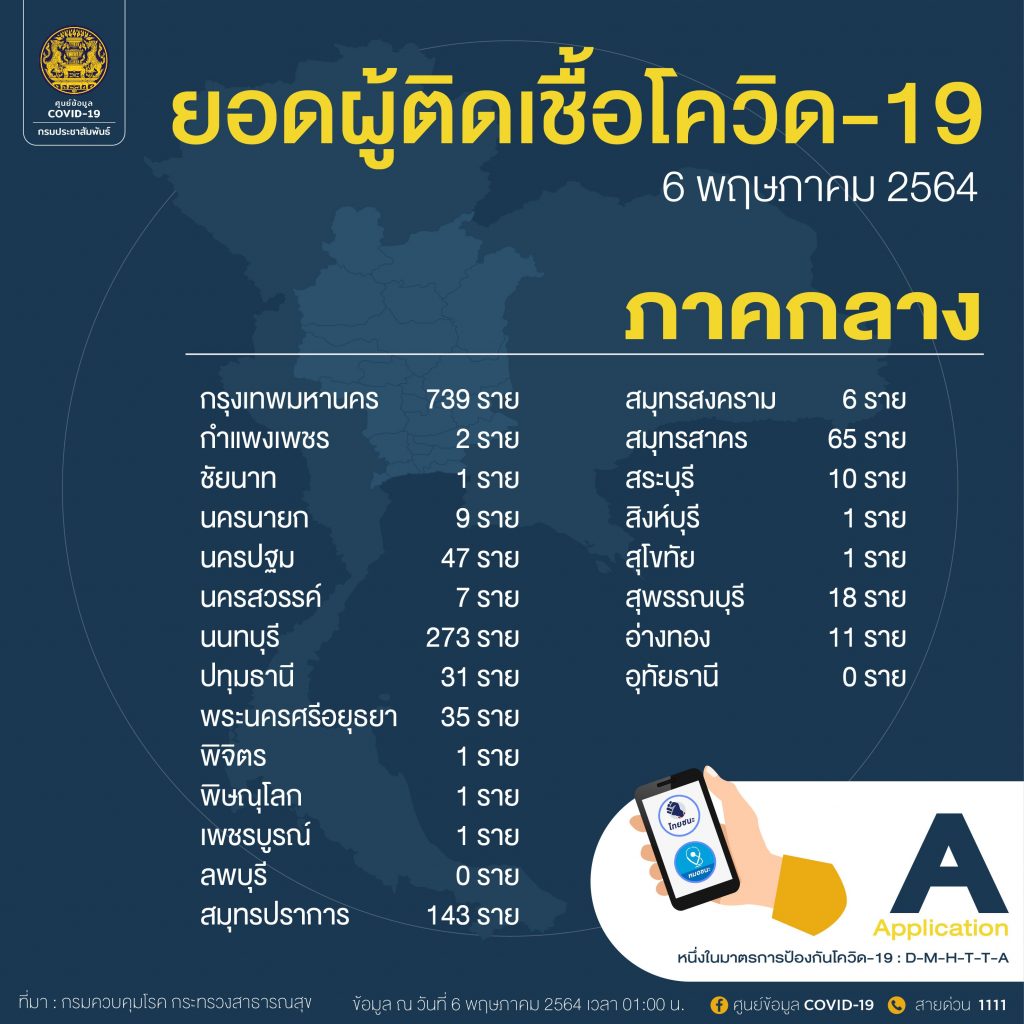 เมื่อวันที่ 6 พฤษภาคม ที่ทำเนียบรัฐบาล นพ.ทวีศิลป์ วิษณุโยธิน โฆษกศูนย์บริหารสถานการณ์โควิด-19 (ศบค.) แถลงรายงานสถานการณ์การแพร่ระบาดของไวรัสโควิด-19 ในประเทศว่า ยอดผู้ป่วยวันนี้จำนวน 1,911 ราย มียอดผู้ป่วยสะสม 76,811 ราย หายป่วยแล้ว 46,795 ราย เหลือผู้ป่วยรักษาอยู่ 29,680 ราย มีผู้เสียชีวิตเพิ่ม 18 ราย และมียอดผู้เสียชีวิตสะสม 336 ราย มีผู้ป่วยอาการหนัก 1,073 ราย และมีผู้ป่วยที่ใส่เครื่องช่วยหายใจ 356 ราย ขณะที่มีผู้รับวัคซีนสะสม 1,601,833 ราย