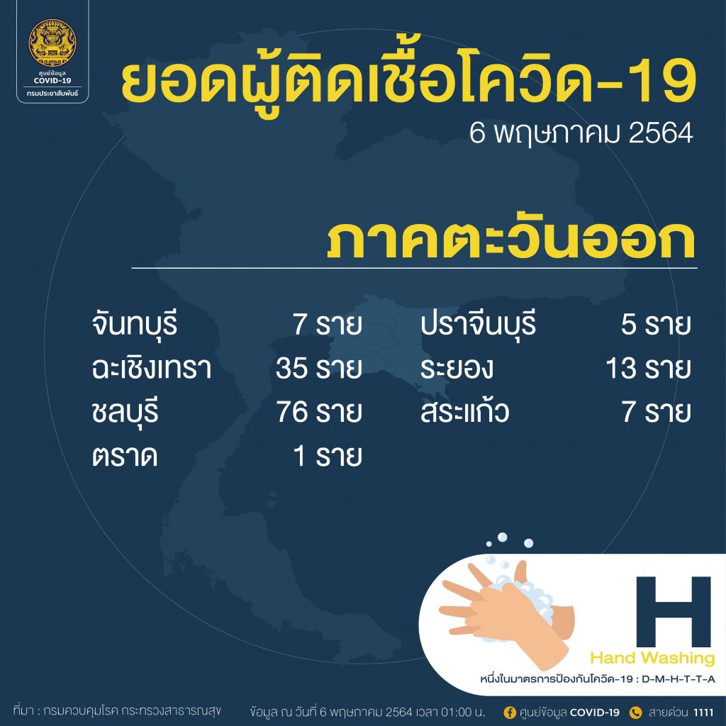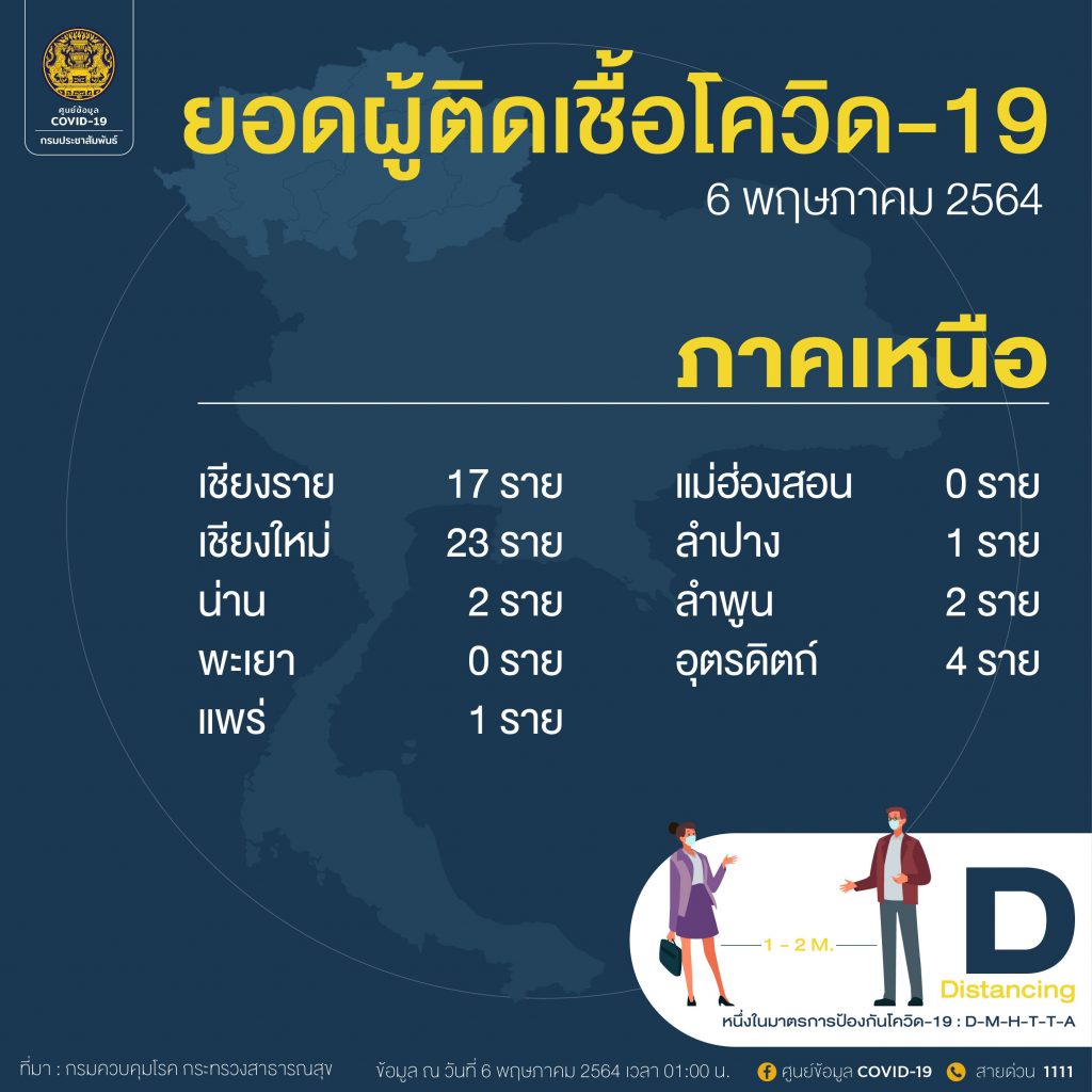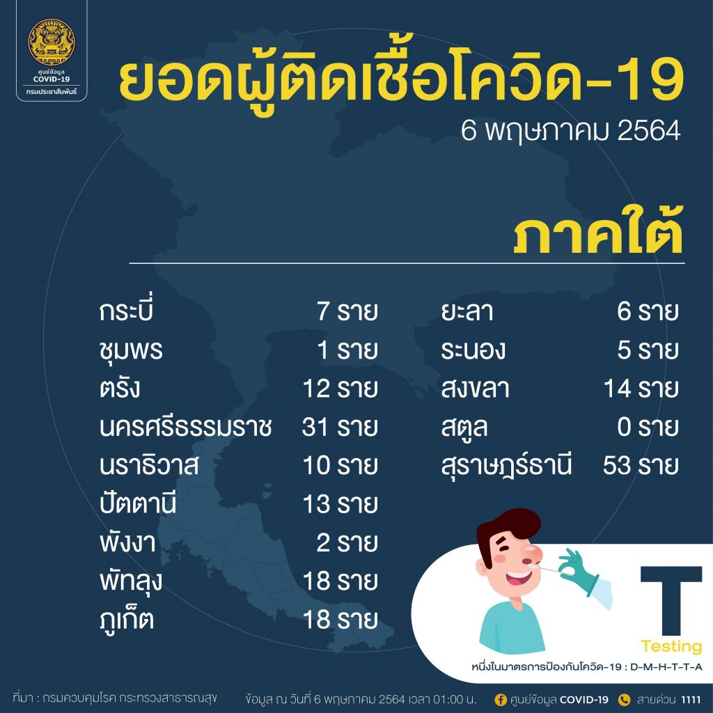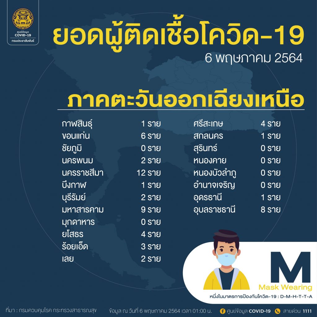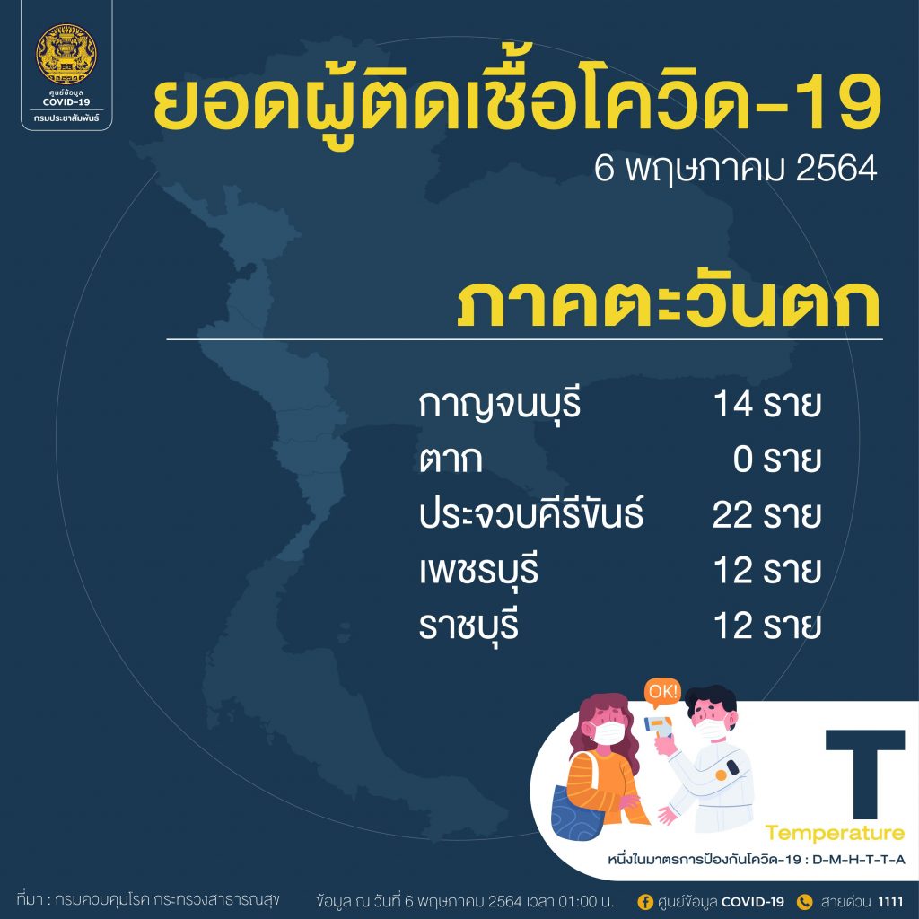 เมื่อวันที่ 6 พฤษภาคม ที่ทำเนียบรัฐบาล นพ.ทวีศิลป์ วิษณุโยธิน โฆษกศูนย์บริหารสถานการณ์โควิด-19 (ศบค.) แถลงรายงานสถานการณ์การแพร่ระบาดของไวรัสโควิด-19 ในประเทศว่า ยอดผู้ป่วยวันนี้จำนวน 1,911 ราย มียอดผู้ป่วยสะสม 76,811 ราย หายป่วยแล้ว 46,795 ราย เหลือผู้ป่วยรักษาอยู่ 29,680 ราย มีผู้เสียชีวิตเพิ่ม 18 ราย และมียอดผู้เสียชีวิตสะสม 336 ราย มีผู้ป่วยอาการหนัก 1,073 ราย และมีผู้ป่วยที่ใส่เครื่องช่วยหายใจ 356 ราย ขณะที่มีผู้รับวัคซีนสะสม 1,601,833 ราย