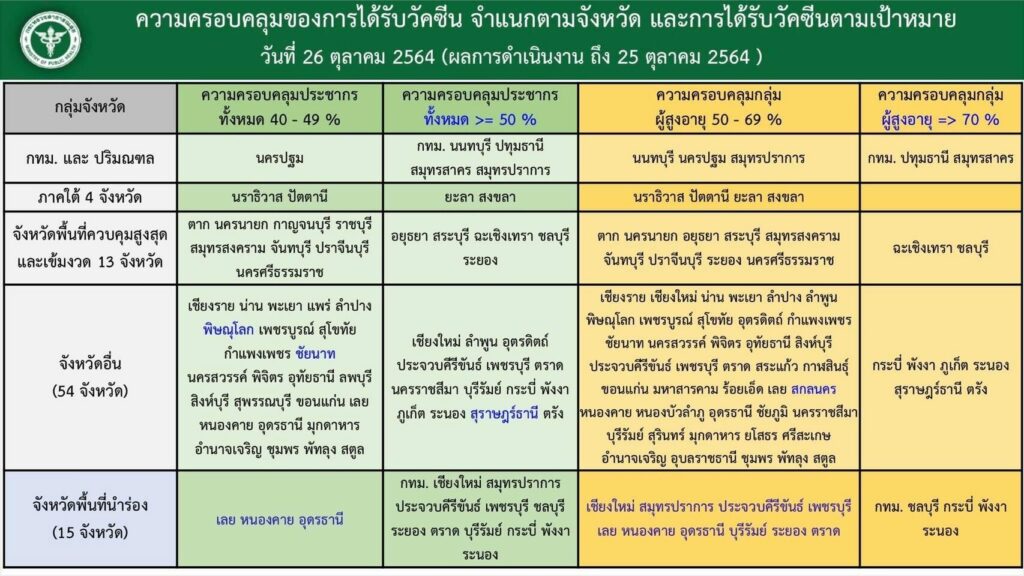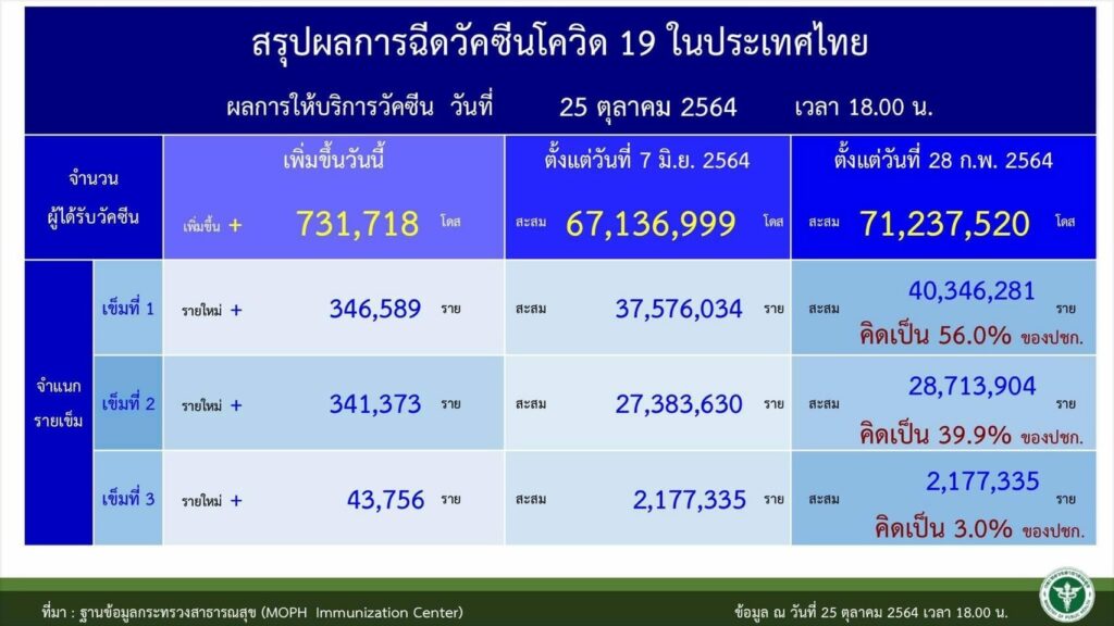 วันที่ 26 ตุลาคม 2564 ศูนย์บริหารสถานการณ์การแพร่ระบาดของโรคติดเชื้อไวรัสโคโรนา2019 (ศบค.) รายงาน ผลสรุปการฉีดวัคซีนทั้ง 77 จังหวัด ตั้งแต่วันที่ 28 กุมภาพันธ์-วันที่ 25 ตุลาคม 2564 มียอดสะสม 71,237,520 โดส แยกเป็นเข็มที่ 1 จำนวน 40,346,281 ราย คิดเป็น 56% ของประชากร เข็มที่ 2 จำนวน 28,713,904 ราย คิดเป็น 39.9% ของประชากร และเข็ม 3 จำนวน 2,177,335 ราย คิดเป็น 3% ของประชากร